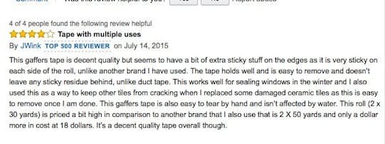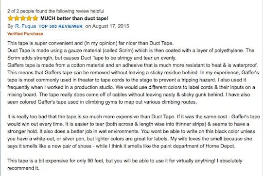 As I said, there are many brands of gaffers tape but this is definitely one of the better ones. I will continue using it and will buy more when my roll has been depleted.